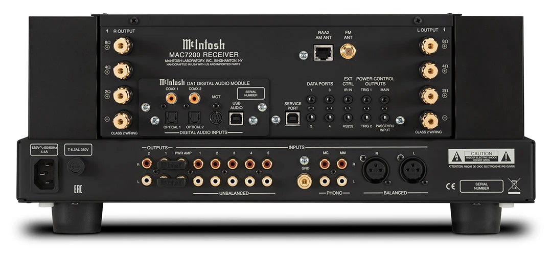 The digital inputs are contained in McIntosh’s DA1 Digital Audio Module; DA1 can be replaced by future modules to easily keep MAC7200 up to date with the latest digital audio technologies. At the heart of DA1 is a powerful 8-channel, 32-bit Digital-to-Analog Converter (DAC) used in Quad Balanced mode. PCM signals up to 32-bit/384kHz can be played via the USB input, allowing for playback of high resolution audio up to DSD256 and DXD 384kHz levels. The coax and optical inputs support up to 24-bit/192kHz files.Â