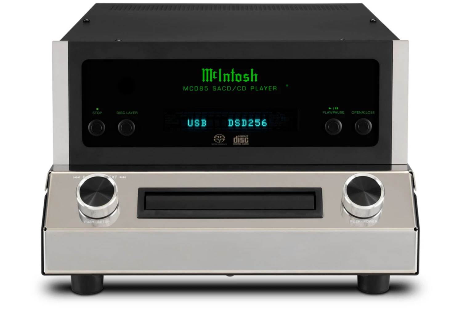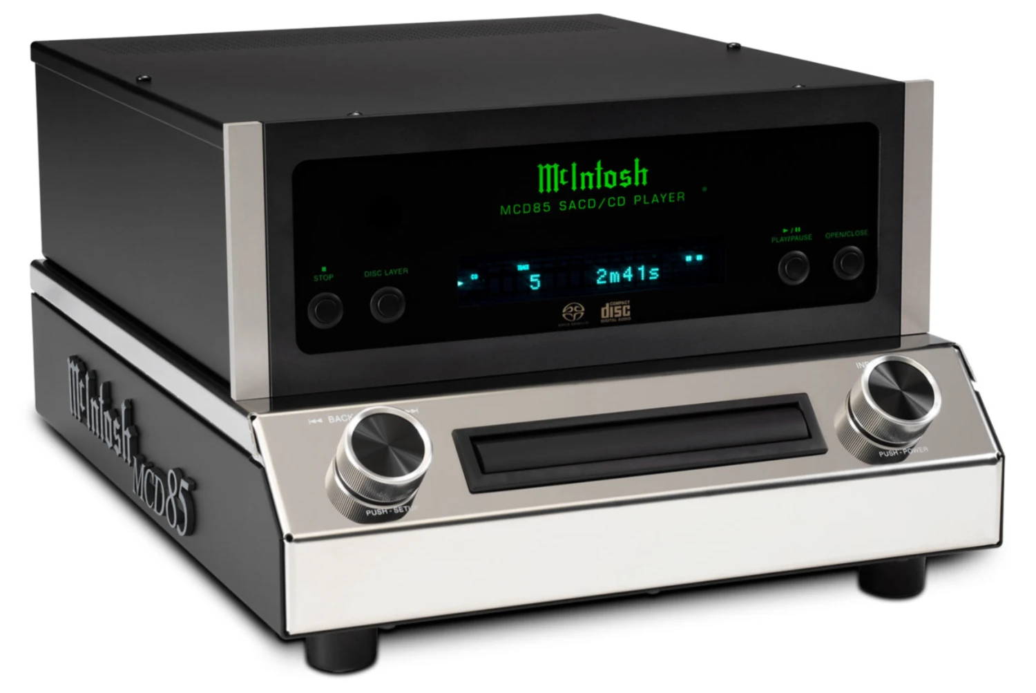 The MCD85 employs 2x read speed, meaning all discs placed in its sturdy die-cast tray are read at higher speeds, allowing their data to be stored in a buffer memory for better error correction and tracking. The tray features a new, custom front beveled nose to match the angle of the chassis and provides smooth and quiet disc handling. Disc reading is performed in the high-quality disc mechanism by a twin laser optical pickup that uses a single objective lens with two laser units, with each employing different wavelengths that are optimized for SACD and CD playback. Power Control and data ports allow for seamless integration with other McIntosh home audio system components.