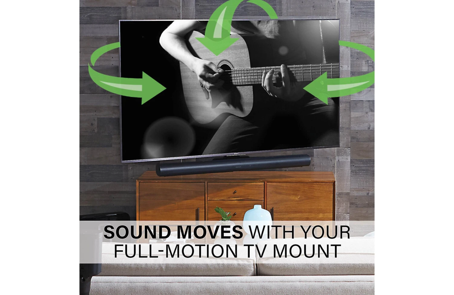 The bracket connects directly to your wall mount, so your Sonos Arc will always remain in the same plane as your TV, no matter how you swivel or tilt it. You can use the bracket with fixed, swivel, or full-motion mounts.