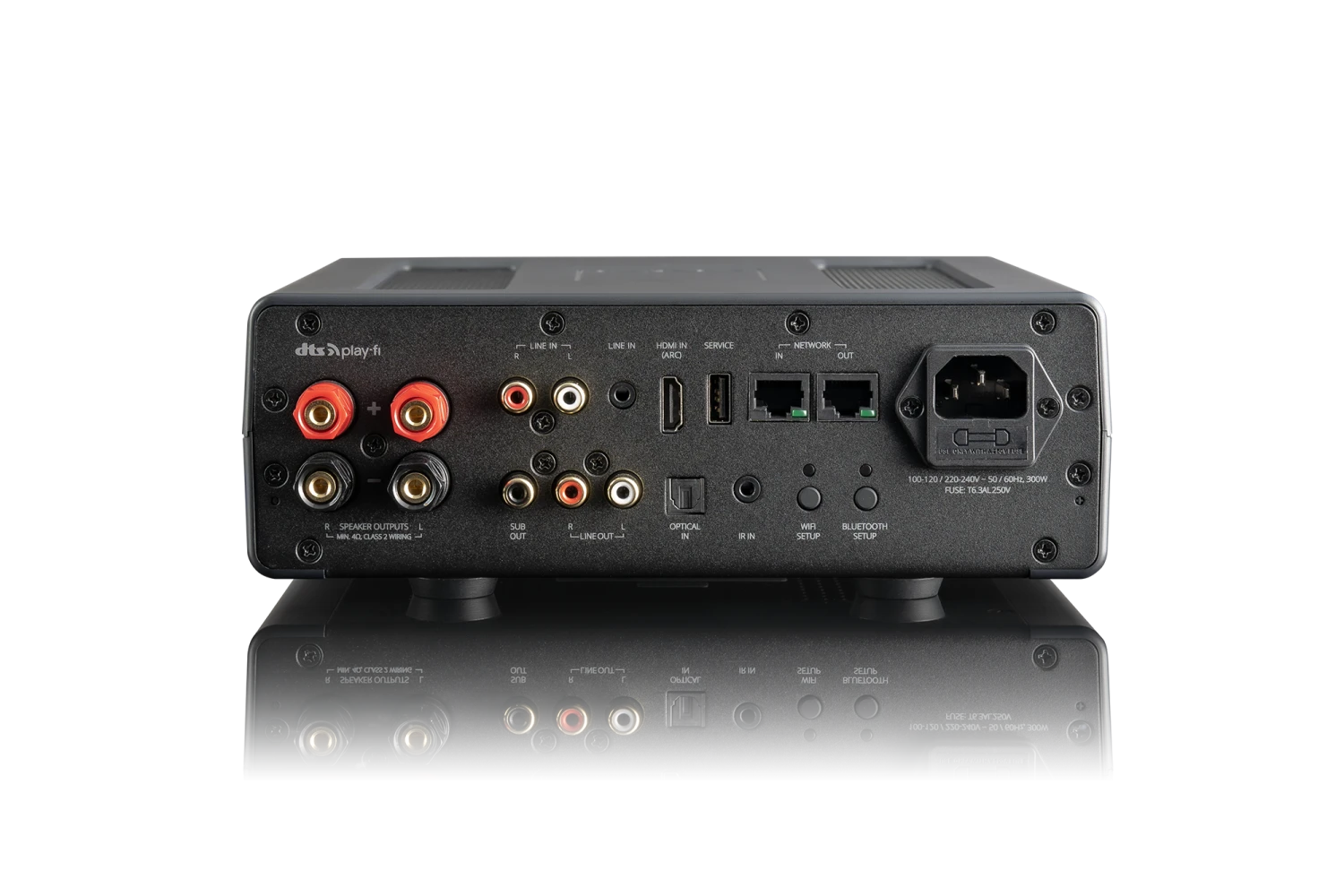 Streams Hi-Res audio wirelessly while delivering 300 watts of effortless, pristine power (150 watts x 2). Features WiFi, Apple Airplay 2, Chromecast for Android phones and other devices, and Bluetooth. Connect directly to your TV via HDMI or other components via Line In, Optical, and more. Control via smartphone/desktop app, IR remote, front panel, or voice.